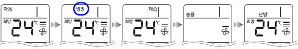 참고로 2014년 이후 모델은 [모드] 버튼, 그 이전 모델은 [운전선택] 버튼입니다. 단, ‘난방’ 기능이 없는 제품은 난방을 선택하더라도 제품에서 인식하지 않습니다.